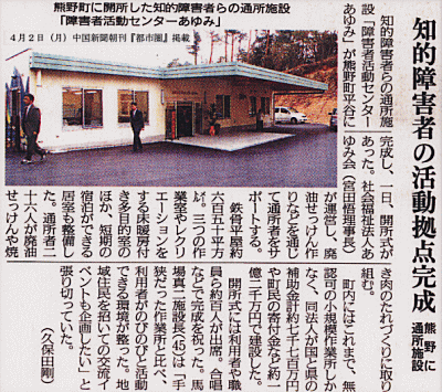 1999年には、人数が増えてきて、双方とも場所が手狭になってきたため、別の場所へ統合移転し、さらに2007年4月には、社会福祉法人あゆみ会「障害者活動センターあゆみ」として熊野町平谷へ活動拠点を移しました。 |