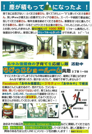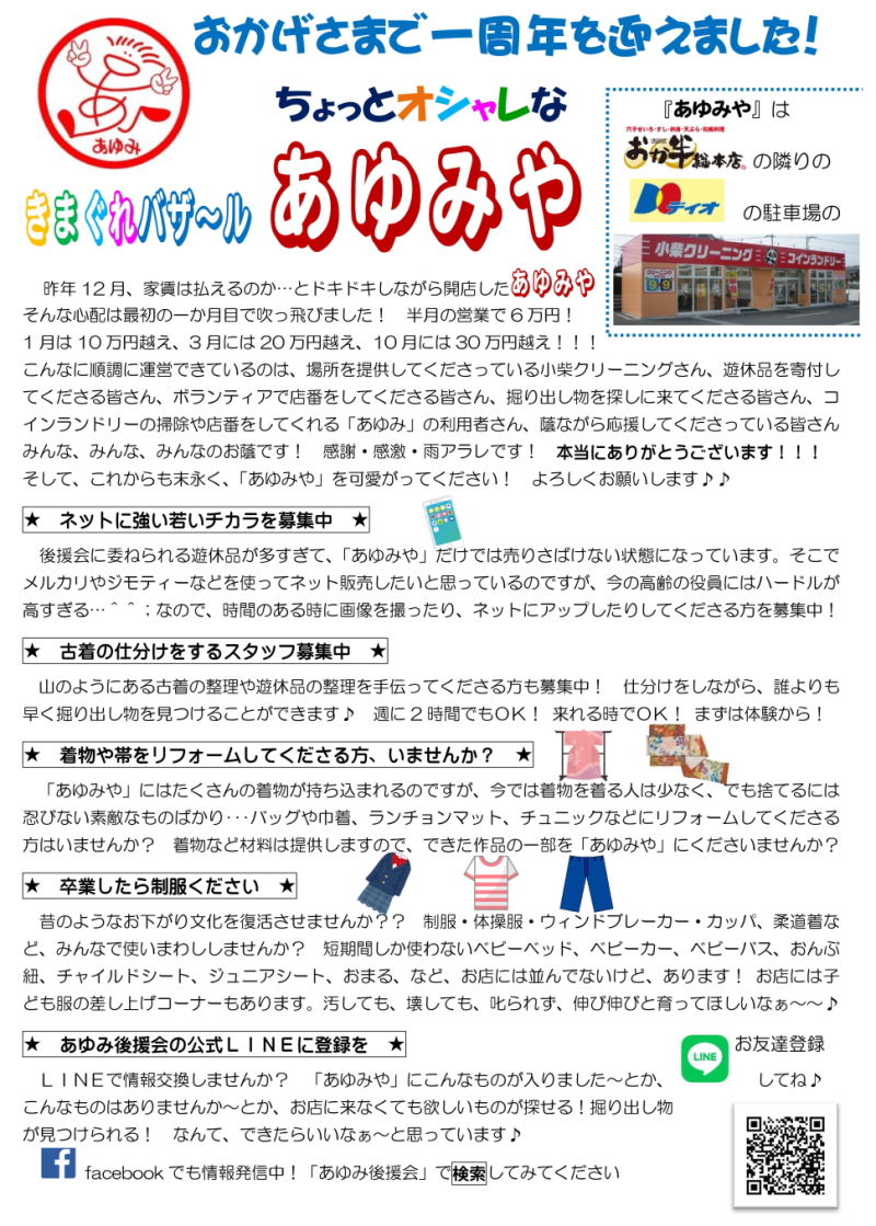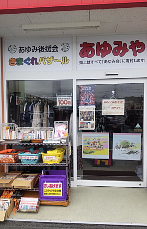 遊休品や古着を販売しています。すべて頂き物です。後援会役員の方や、あゆみ利用者の保護者の方 などが交代で店番をしてくださっています。(ボランティアです)